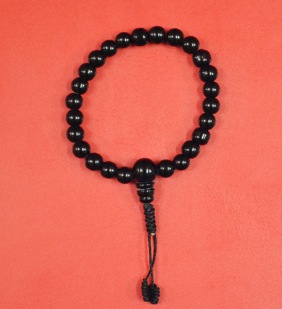 Onyx-Handmala mit 25 Perlen und einer Guru-Perle. Handgelenk-Mala werden für Niederwerfungen und Reisen verwendet. Sie ist auf einem dehnbaren Band.