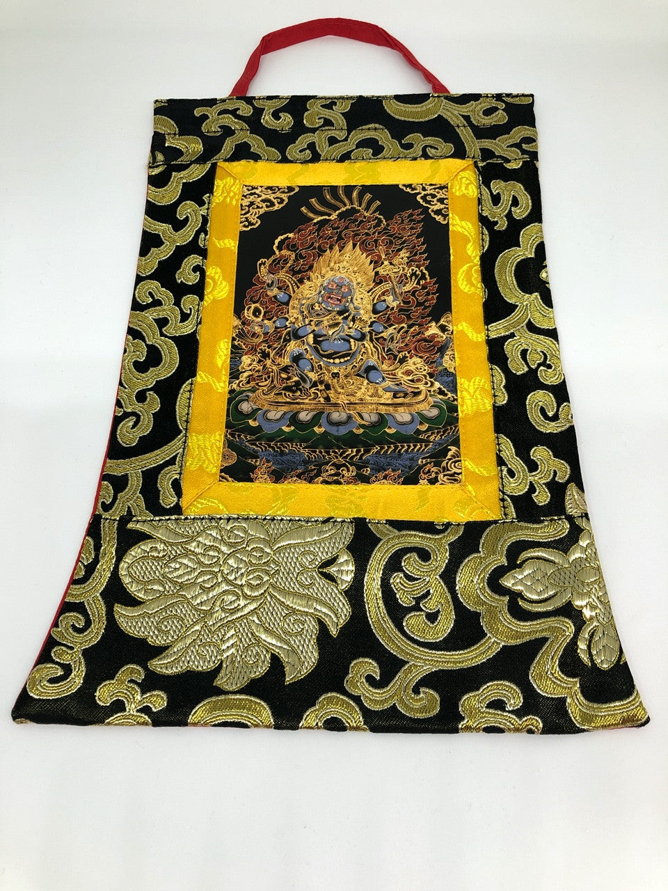 Dies ist ein kleines schwarzes Mahakala-Thangka-Wandbehang. Das Bild im Inneren ist ein Papierfoto, eingefasst mit wunderschönem Seidenbrokat.