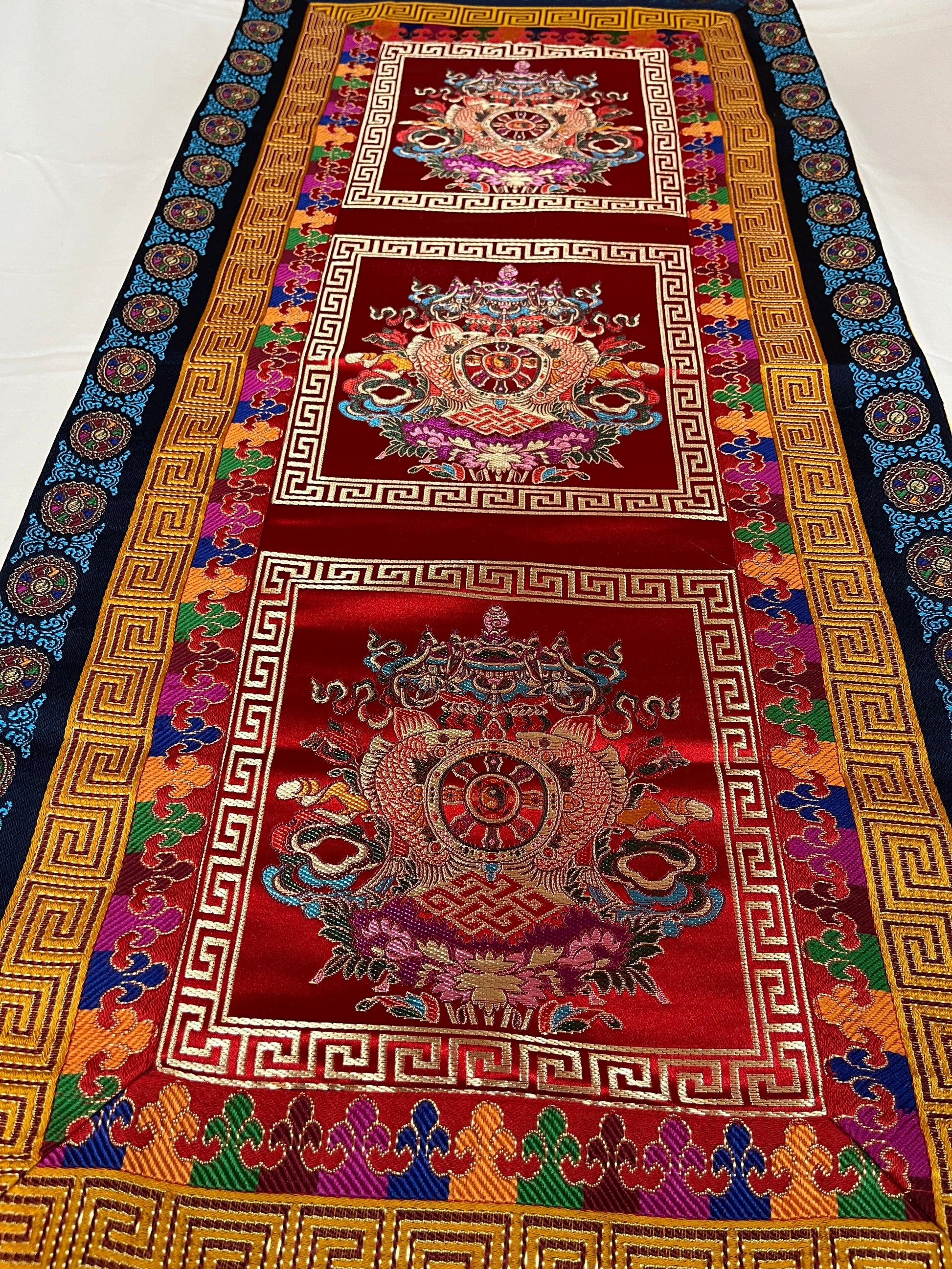 Elevate your shrine room with this authentic Tibetan Buddhist silk brocade table runner. Handcrafted in Nepal, this exquisite piece features traditional auspicious symbols and an elegant Wheel of Life design border. The rich silk brocade adds a touch of sacred beauty to your home altar or meditation space, honoring Buddhist traditions while creating a peaceful atmosphere for your spiritual practice.