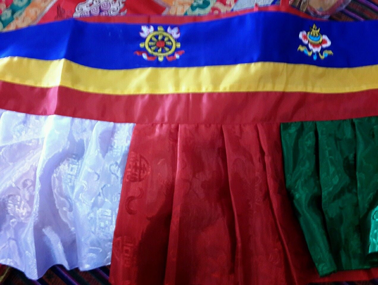 Cette bannière à volants en shambu tibétaine très décorative et classique est accrochée autour du haut de la fenêtre, de la porte ou de la salle de sanctuaire le long du plafond. Cette tenture murale en soie multicolore de haute qualité est fabriquée à partir de bandes de soie avec huit symboles porte-bonheur brodés.