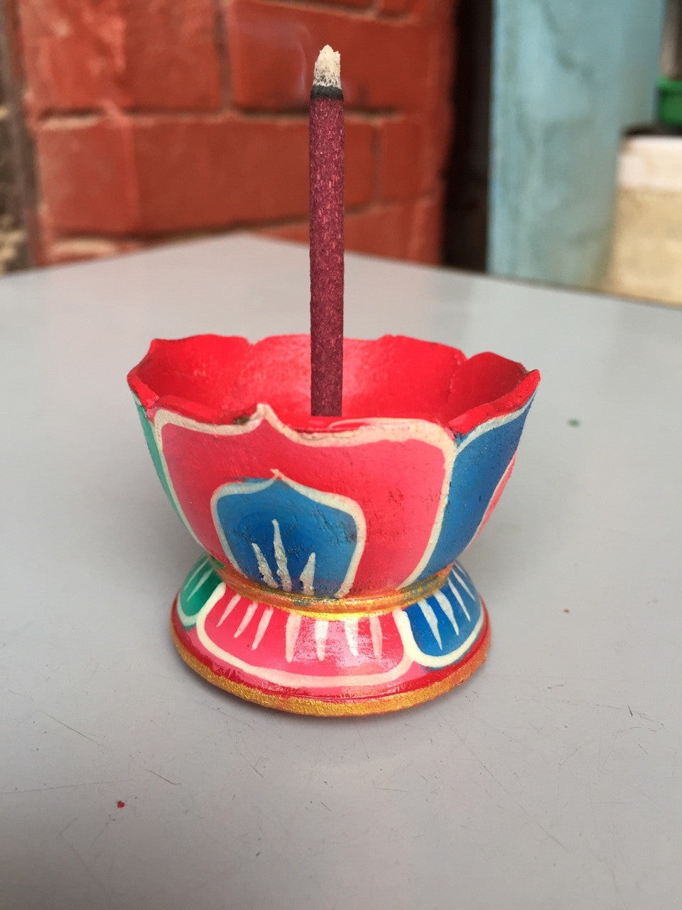 Ce porte-encens de petite taille est entièrement fabriqué et peint à la main avec un motif de lotus par nos artisans tibétains au Népal. Ce brûle-encens en bois retient l'encens de manière appropriée pour recueillir toutes les cendres qui restent après la combustion de l'encens. Il a un trou au milieu, composé d'un anneau en métal pour maintenir correctement l'encens.
