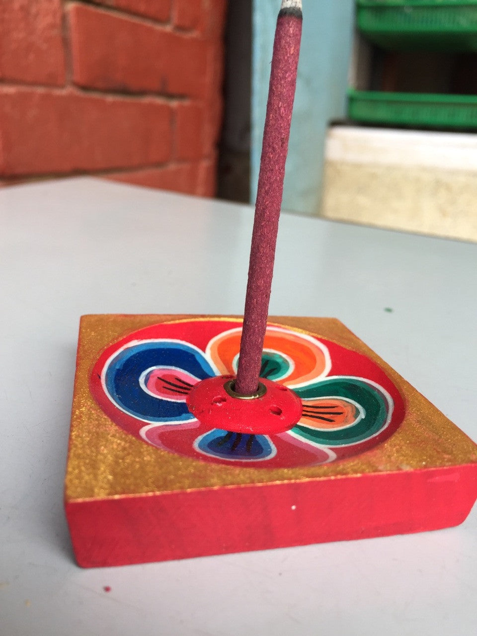 Ce petit porte-encens de forme carrée est entièrement fabriqué et peint à la main avec un motif de lotus par nos artisans tibétains au Népal. Ce brûle-encens en bois retient l'encens de manière appropriée pour recueillir toutes les cendres qui restent après la combustion de l'encens. Il a un trou au milieu, composé d'un anneau en métal pour maintenir correctement l'encens.