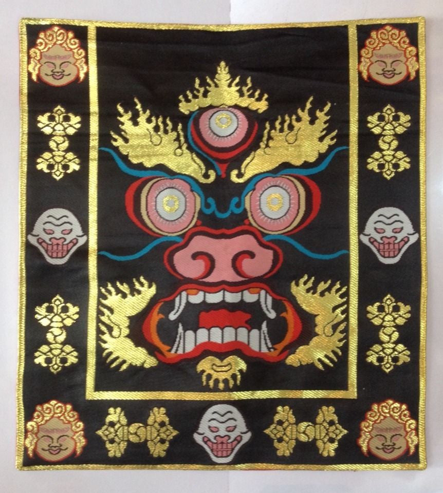 This is MAHAKALA SILK BROCADE Altar Cloth / Shrine Cover can be used for decoration or as a THILDEN FOR BELL AND DORJE. It is used to place bell and dorje during prayer ceremonies or when you do your meditation practice. this shrine cover is made from traditional Tibetan style hand made silk brocade , with mahakala in the center. It can be used to decorate your meditation room or add oriental style in any part of your home.